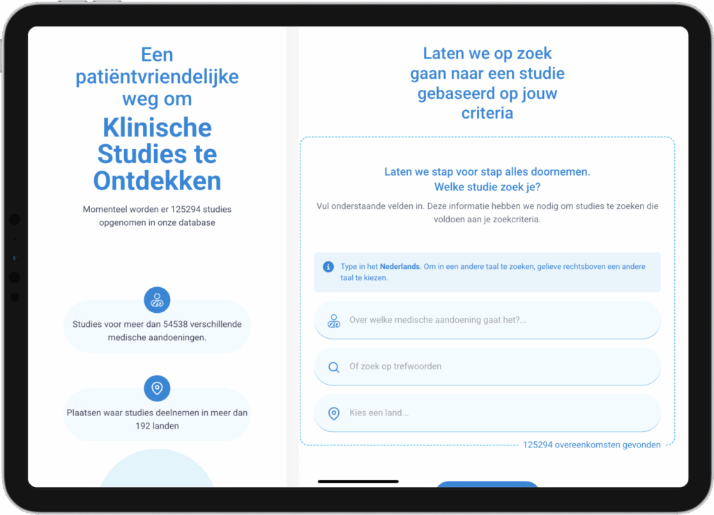 We bieden patiëntenorganisaties een kant-en-klare service om hun eigen bewustwordingscampagne voor klinische onderzoeken te ontwerpen en lanceren—aangepast aan hun ziekte-gebied en publiek.